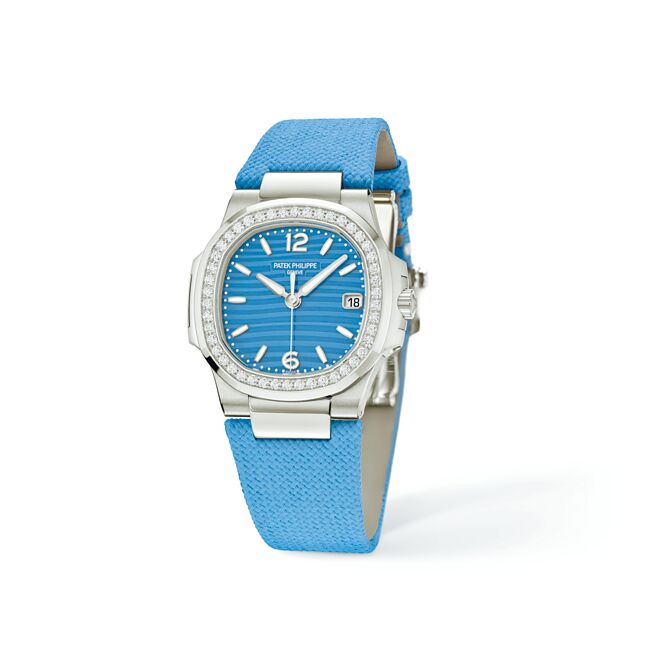百達翡麗今年推出金鷹Nautilus女表,淺藍色錶盤飾以波紋,十分唯美浪漫。(Patek Philippe提供)