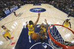 這場比賽湖人到底沒有變陣,雖然打出6-0開局,但禁區防線還是搖搖欲墜。勒布朗5分鐘沒出手得分,湖人籃下明顯還是被掘金突爆,讓對手半節拿了20分,一直到6分49秒,勒布朗纔好不容易在空手切底線後找到接球扣籃的機會。